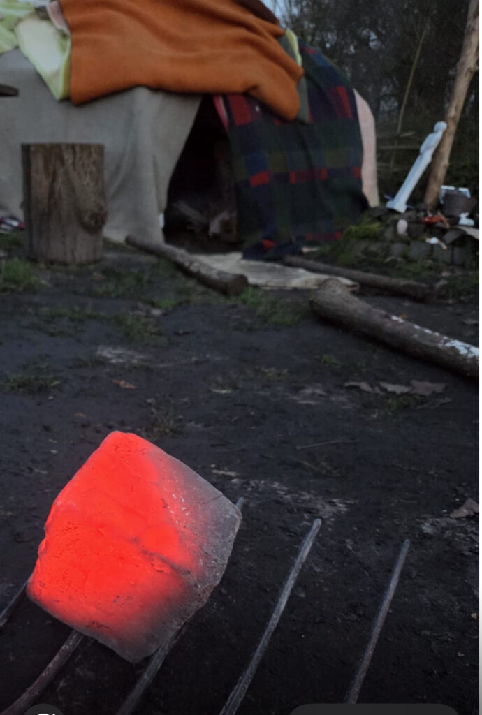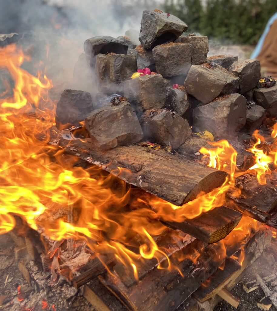 Na de stenenceremonie ontsteken we gezamenlijk het vuur. De stenen worden langzaam verhit tot ze roodgloeiend zijn. Het vuur nodigt uit tot stilte, aanwezigheid en afstemming — op jezelf, op de groep en op het ritme van de dag.