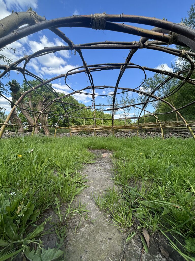 De zweethut is een lage, koepelvormige hut van wilgentakken, afgedekt met dekens. Ze wordt ook wel het huis van de adem genoemd: een plek van geborgenheid, verstilling en terugkeer naar de basis.